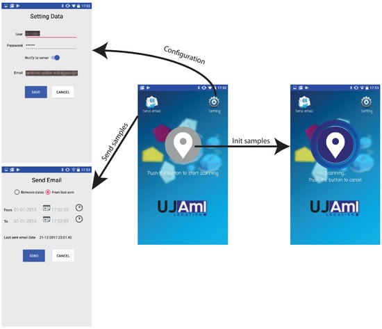 As far as our practical work, the UJAmI Location system, we discuss some important considerations such as security, privacy and deployment in a real environment. The proposed UJAmI Location system contains specific data regarding location and daily life, that is, information of a private nature. Security considerations need to be addressed in the mobile device []. In our case, the device only collects the RSSI values emitted by the beacons. These RSSI values contain noise, imprecision and fluctuations, requiring a methodology to compute the location correctly. The RSSI data are sent to the server by https protocol where the area or location of the person is computed. In our case, in a server on a web system with encrypted authentication where the RSSI data are received, processed and stored.