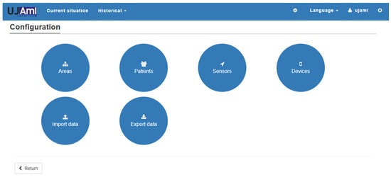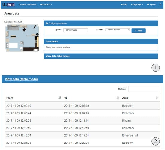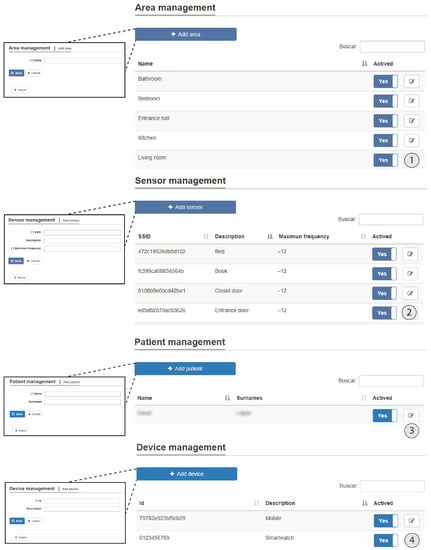 From the admin role, the following functionality is provided: beacon management, user management and real-time monitoring of the inhabitant’s location in the areas that have been previously defined. Figure 10 and Figure 11 show the main screens of this monitoring system.