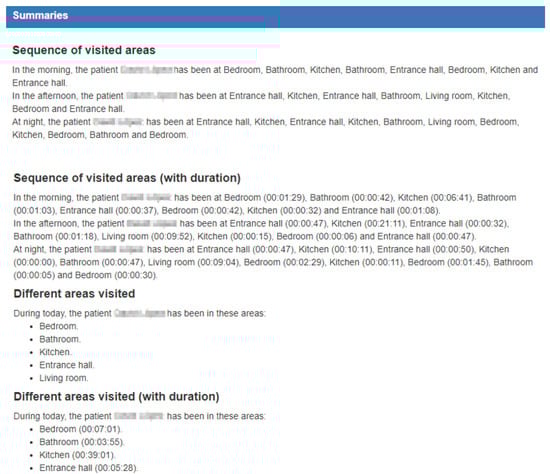 In addition, the system is not only capable of displaying the inhabitant’s location as shown in Figure 12, it is also capable of displaying a record of the inhabitant’s activity in natural language, showing a summary of what the inhabitant has done over a specific day. An example of this is illustrated in Figure 13.