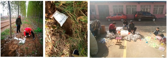 The sampling depth of the topsoil is randomly between 0~20 cm. The soil at each sampling point was crushed, the debris in samples were picked out, and the same amount of sample was mixed into different clean cloth sample bags, not less than 1 kg into an individual bag. All samples were collected and analyzed in the same way within one year in sunny weather. Sample collection and processing site are shown in Figure 2.