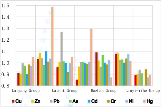 As shown in Table 4 and Figure 3. Through analysis, it is found that the heavy metal elements in the topsoil of Laiyang Group are close to the background values of the whole region, with the GCBRs of 0.90~1.05. The ratio of Hg to the background values of the whole region is relatively high (GCBRs 1.48), which is the main distribution area of most heavy metal anomalies. Qingshan Group, except for As (GCBRs 0.98), is relatively lower than others. Moreover, excluding the GCBRs of Pb (1.27) as obviously higher, the other elements in this geological unit are close to the background value of the whole area (GCBRs 0.92~1.05), which is the main distribution area of Pb anomaly. In Dasheng Group, except Cu (GCBRs 0.85) and Hg (GCBRs 1.29), other elements are close to the background values of the whole region (0.97~1.01). Due to the differences of accumulation origin and properties of Dazhan Formation and Heituhu Formation, it is found that, except Hg in the Dazhan Formation, which is lower than the background value of the whole area (GCBRs 0.87), the heavy metal elements in the topsoil in these two units are close to and slightly higher than the background values of the whole area, especially higher than the background value of the whole area in the Heituhu Formation. Compared with the background values of the whole region, the heavy metal elements in the topsoil of Linyi and Yihe Formations are lower or even significantly lower, which is the main distribution area of negative anomaly, indicating that there is no heavy metal pollution source at the source and banks of the river. Based on the comprehensive analysis of the whole region, it is found that the background values of heavy metal elements in different geological unit areas have a good correlation with the background values of the whole region, and only show anisotropy at a few points, indicating that the content of heavy metal elements in the topsoil of the whole region is mainly affected by the geological background.