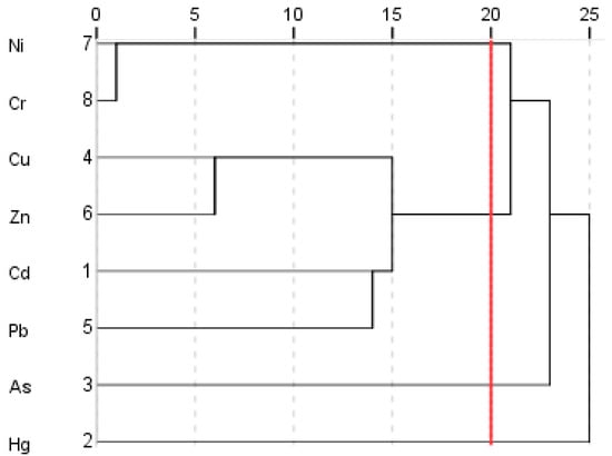 In the cluster analysis, elements with symbiotic or similar genesis should have sufficient similarity or homogeneity, while elements with large differences or dissimilar genesis should have great heterogeneity [41]. The heavy metal elements in root soil samples were classified according to similarity degree by system clustering method, and the possible symbiotic relationship or genetic relationship among these heavy metal elements were analyzed. As shown in Figure 5, when the confidence level is five, the eight HMs can be divided into seven categories. Then, only nickel and cadmium are divided into the same group, and other HMs form a group respectively. When the confidence is 10, the eight HMs can be divided into six categories. The first category is Ni and Cr, the second category is Cu and Zn, and other four HMs form a different group. When the confidence is 20, the eight heavy metal elements can be divided into four categories. The first category is Ni and Cr, the second category is Cu, Zn, Cd, and Pb, while the third and fourth categories are As and Hg, respectively. The elements in each category are correlated with each other, displaying high homology.