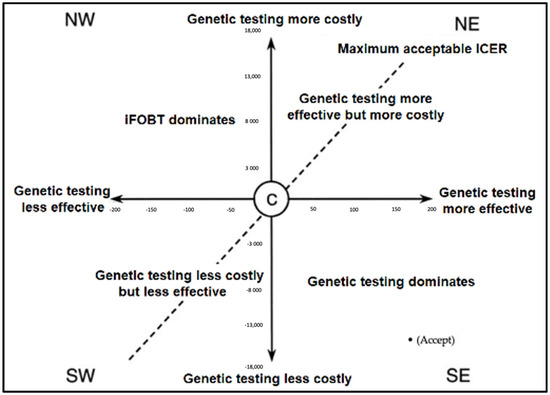 Based on the ICER calculations, it was found that genetic testing dominates iFOBT testing when considering the total cost of managing CRC patients and the QALYs gained as the effectiveness. Figure 1 exhibits a cost-effectiveness plane for CRC genetic testing compared to iFOBT testing. The figure shows that the ICER fell in the southeast quadrant, confirming that genetic testing has good value for money (dominant), and decision makers should consider investing in and expanding the use of genetic testing in routine CRC screening for clinical practice.