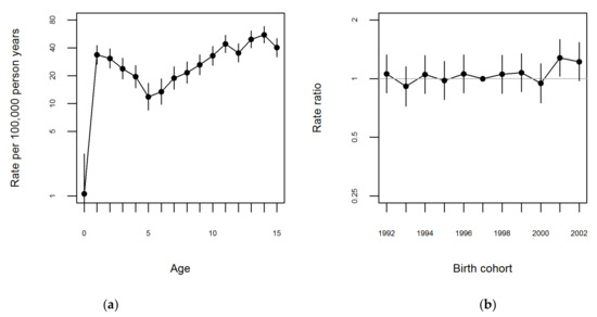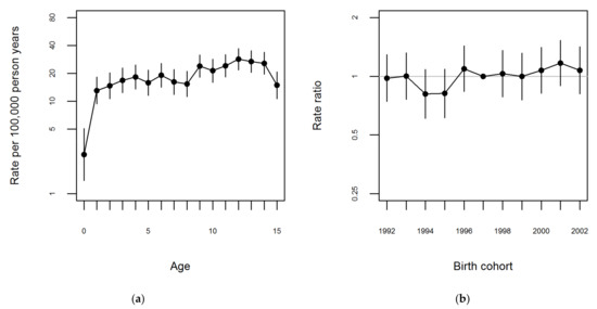 There were no evident peaks for any age group at diagnosis for boys (Figure 1a and Figures S3 and S4). For girls two peaks were visible, however not markedly; with a first peak between the ages 0–5 years and the second between ages 12–15 years (Figure 2a and Figures S2 and S4). Figure 1b and Figure 2b show the rate ratios relative to the 1997 birth cohort for boys and girls, respectively. Overall, the rate ratios (Figure 1b and Figure 2b) as well as the sex-specific incidence rates (Figure S1) were very stable across birth cohort years.