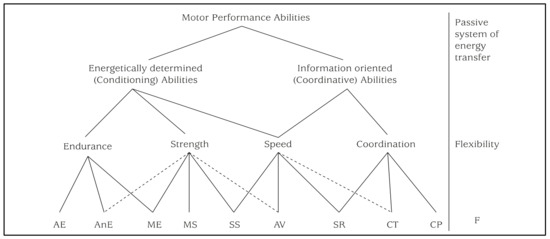 According to Bös and Mechling [30], MPA is on a first level differentiated according to the poles of energy and information into physical (energetic) and coordinative (information-oriented) abilities. On a second level, there is a breakdown into the much-cited “basic motor qualities” of endurance, strength, speed, coordination, and flexibility. The assignment of endurance and strength abilities to the energetically determined functional processes results from the distinction between the cardiovascular system and the skeletal muscles as central systems of energy production and energy transport in the human organism. The extent, the mass, and the structure of skeletal muscle are considered prerequisites for strength performance. The performance of the cardiovascular system represents determining and limiting variables for endurance performance.