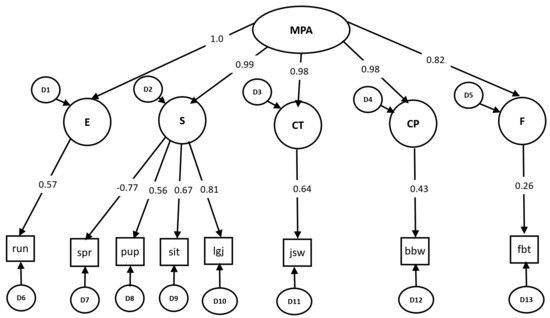 MPA = motor performance ability; E = endurance; S = strength; CT = coordination under time pressure; CP = coordination with precision demands; F = flexibility; run = 6 min run; spr = 20 m sprint; pup = push-ups; sit = sit-ups in 40 s; lgj = long jump; jsw = jumping sideways; bbw = balancing backwards; fbt = forward bending of the trunk.