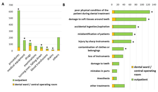 We analyzed the contents of the incident reports and found that “procedures” was the most common among all reports. In terms of the location, the most common incident at the “dental ward/central operating room” was “drug-related”, while that at the “outpatient ward” was “procedures” (Figure 2A). In the dental ward/central operating room, the numbers of incident reports related to “drugs”, “turning over, falling down”, “blood transfusions”, and “drains” were significantly higher than those in outpatient wards (p < 0.05). On the other hand, in outpatient wards, the numbers of incident reports related to “procedures” and “medical equipment”, were significantly higher than those in the “dental ward/central operating room” (p < 0.05). We further classified “procedures” into 10 groups. We found that “poor physical condition of the patient during dental treatment” was the most common cause, followed by “damage to soft tissues around teeth” and “accidental ingestion/aspiration” (Figure 2B). The numbers of incident reports related to “poor physical condition of the patient during dental treatment”, “damage to soft tissues around teeth”, “accidental ingestion/aspiration”, “misidentification of patients”, “injury by sharp instruments”, and “contamination of clothes or belongings” were significantly greater in outpatient wards than those in dental ward/central operating rooms, but there was no significant difference in “loss of instruments”, “damage to teeth”, “mistakes in parts”, and “anesthesia”.