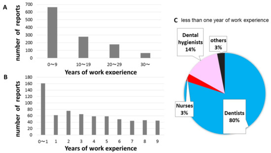 In terms of work experience, the number of incident reports was higher in the ”0–9 years” group than in the other groups, and the number of incident reports tended to decrease as the years of work experience increased (Figure 3A). When comparing subjects in the “0 to 9 years” group, subjects with less than one year of work experience had the highest number of incident reports (Figure 3B). In terms of subjects with less than one year of work experience, approximately 80% of the reports were from dentists (Figure 3C).