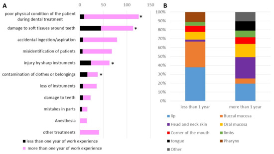 (A) Comparison of incidents related to procedure reported by dental care workers with less or more than one year of work experience. (* p < 0.05) (B) Comparison of injury site of “damage to soft tissues around teeth with less or more than one year of work experience”.