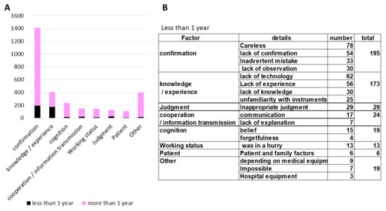 (A) Comparison of factors of incidents reported by dental care workers with less and more than one year of work experience. (B) The cause of the incidents in dental care workers with less than one year of work experience.