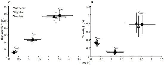 Mean ± standard deviation (SD) (A) displacement and (B) velocity at the events vmax1, vmin, and vmax2, and their timings for the high-bar, low-bar, and safety-bar squat during 3-RM.