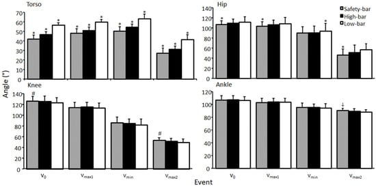 A significant effect of torso and hip flexion angle was found during all events (F ≥ 5.9, p ≤ 0.023, η2 ≥ 0.31). The low-bar condition had the greatest torso angle followed by the high-bar and safety-bar conditions during all events (p ≤ 0.023) (Figure 3). For hip flexion angles, post-hoc tests showed that the participants performed less hip flexion for the safety-bar squat in v0, vmax1, and vmax2 compared to the other squat conditions (p < 0.021), while in vmin, the low-bar condition had greater hip flexion than the other conditions (p ≤ 0.026). For knee extension angles, a significant effect was found for the events v0 and vmax2 (F ≥ 4.5, p ≤ 0.02, η2 ≥ 0.24), while no significant effects occurred during vmax1 and vmin (F ≤ 2.9, p ≥ 0.071, η2 ≤ 0.17). Bonferroni post-hoc tests revealed that the participants squatted with greater knee extension when using the safety-bar condition compared to the low-bar condition at v0 and vmax2 (p ≤ 0.019). A significant effect of squat condition was found for ankle dorsi flexion angle (F ≥ 6.2, p ≤ 0.004, η2 ≥ 0.31). Bonferroni post-hoc tests revealed that the safety-bar condition had greater ankle dorsiflexion than the low-bar condition in vmax2 (p = 0.004). No other significant difference was found in hip extension, knee extension and ankle dorsi flexion angle for all squat conditions (F ≤ 1.2, p ≥ 0.329, η2 ≤ 0.08). For knee valgus there was a significant sex difference found at vmax2 in the high-bar and safety-bar conditions (F ≥ 1.93, p ≤ 0.04, η2 ≥ 0.31) where men had higher knee valgus than women (Figure 4). No other significant differences were found between men and women for any joint kinematic measurements for any squat conditions during any events (F ≤ 3.13, p ≥ 0.08, η2 ≤ 0.19).