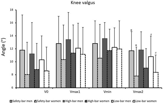 Mean (±SD) knee valgus at the events vmax1, vmin, and vmax2 for the high-bar, low-bar, and safety-bar squat during 3-RM. * indicates a significant difference between sexes in safety-bar squat condition on a p ≤ 0.05 level. # indicates a significant difference between sexes in high-bar squat condition on a p ≤ 0.05 level.