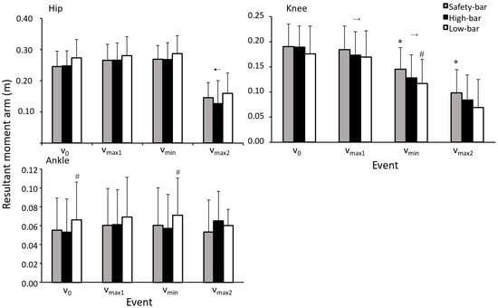 Mean (±SD) hip, knee, and ankle moment arms at the events vmax1, vmin, and vmax2 for the high-bar, low-bar, and safety-bar squat during 3-RM. * indicates a significant difference between this squat condition and low-bar squat on a on a p ≤ 0.05 level. # indicates a significant difference between this squat condition and the high-bar condition on a p ≤ 0.05 level. → or ← a significant difference between this event and all the other events for all squat conditions on a p ≤ 0.05 level.