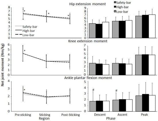 Mean ± SD net joint moments during descent, ascent, pre-sticking, sticking, post-sticking region together with peak net joint moments for the high-bar, low-bar, and safety-bar squat during 3-RM. * indicates a significant difference between this region and all other regions on a p ≤ 0.05 level for all squat conditions. # indicates a significant difference between this squat condition and the low-bar condition on a p ≤ 0.05 level.