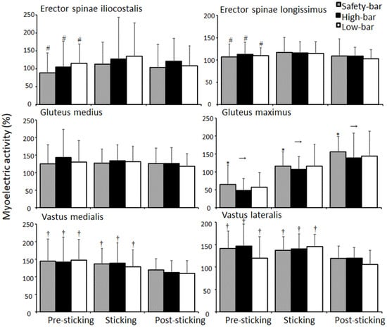 Mean ± SD normalised myoelectric activity for erector spinae iliocostalis, erector spinae longissimus, gluteus medius, gluteus maximus, vastus medialis and vastus lateralis during pre-sticking, sticking, and post-sticking region for the high-bar, low-bar, and safety-bar squat during 3-RM. # indicates a significant difference between the pre-sticking and sticking region for all squat conditions on a p ≤ 0.05 level. * indicates a significant difference between this squat condition and the high-bar condition on a p ≤ 0.05 level. → indicates a significant difference between this region and all other regions for all squat conditions on a p ≤ 0.05 level. † indicates a significant difference between this region and the post-sticking region for all squat conditions on a p ≤ 0.05 level.