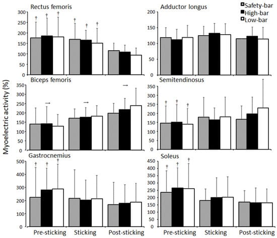 Mean ± SD normalised myoelectric activity for rectus femoris, adductor longus, biceps femoris, semitendinosus, gastrocnemius, and soleus during pre-sticking, sticking, and post-sticking region for the high-bar, low-bar, and safety-bar squat during 3-RM. → indicates a significant difference between this region and all other regions for all squat conditions on a p ≤ 0.05 level. † indicates a significant difference between this region and the post-sticking region for all squat conditions on a p ≤ 0.05 level.