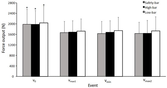 Mean (±SD) force output at the events v0, vmax1, vmin, and vmax2 for the high-bar, low-bar, and safety-bar squat during 3-RM. * indicates a significant difference between this event and all other events for all squat conditions on a p ≤ 0.05 level.