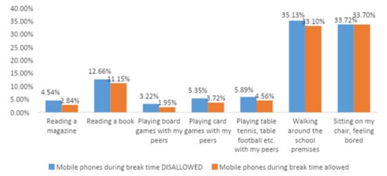 Interestingly, we found roughly the same number of bored children in schools where mobile phones were banned during recess. In schools where mobile phones were banned during recess, the dominant activity was walking around the school grounds, sitting on a chair, feeling bored and reading books, followed by sports activities and card games. The application of the chi-squared test confirmed the existence of significant differences between the two groups. This undoubtedly creates a debate around the current motivations surrounding young people’s entertainment. We find ourselves in a context in which the Internet and the use of mobile devices occupy a large percentage of young people’s overall entertainment throughout the day. Given this evidence, it is necessary for parents and educators to establish a debate about the motivations of young people and how to encourage healthy leisure and free time habits, as well as reducing the use of mobile devices [10].