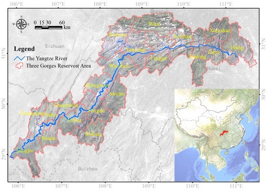The TGRA is located in the upper and middle reaches of the Yangtze River (Figure 1) and lies between 28°31′–31°44′ N and 105°50′–111°40′ E. The reservoir area is located in the Sichuan Basin and the Yangtze River Basin, which joins the plain rivers. Its easternmost part is Yichang, Hubei Province, and its westernmost part is Baxian County, Chongqing City. It is about 5.8 × 104 km2, containing four counties in southwestern Hubei (Yiling, Zigui, Xingshan, and Badong) and 16 districts and counties in east-central Chongqing (Wuxi, Wushan, Fengjie, Yunyang, Kaixian, Wanxian, Zhongxian, Shizhu, Fengdu, Wulong, Fuling, Changshou, Yubei District, Banan District, the main city of Chongqing, and Jiangjin City). In 2018, the resident population of the TGRA was 21,025,900, with an urbanization rate of 64.42%. The TGRA has a humid, mid-subtropical monsoon climate, with a mean annual temperature of 20 °C and mean annual precipitation of 1200 mm. It is a typical biodiversity hotspot with rich plant resources in China.