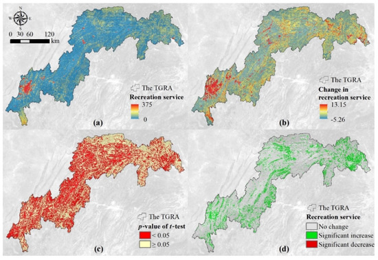 Spatial variation of the recreation-service proxy in the TGRA between 2000 and 2015. Average (a) and the modeled slope (b) of the recreation service, p-value of t-test for the slope (c), and the changes of recreation service (d). Note: In the figure (d), “No change” shows that the recreation service did not significantly change (slope = 0), and “Significant increase” refers to slope > 0 and p < 0.05, while significant decrease refers to slope < 0 and p < 0.05.