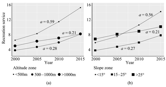 Temporal variations of the recreation-service proxy in different zones of altitude (a) and slope (b) in the TGRA. Note: We used a least square linear regression model to fit the recreation proxy. The changing trend is described by the modeled slope, which is a in the figure.