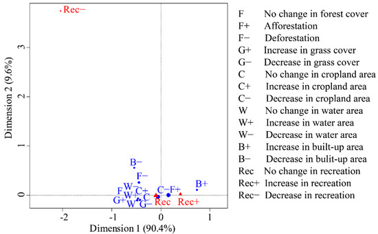 Correspondence analysis between landscape changes and recreation-service changes showed that the first dimension explained 90.4% of the variance, while the second dimension explained only 9.6% of the variance. According to the corresponding analysis diagram (Figure 4), most of the landscape-change categories were concentrated near the “no change in recreation” indicator (Rec). It is illustrated that these landscapes could not significantly alter the recreation service. In addition, the concentration also demonstrated that they have extremely similar impacts on the recreational service. The loss of afforestation, cropland, and the increase in construction land were distributed near the “increase in recreation” indicator (Rec+), showing that these landscape changes could effectively contribute to the enhancement of recreational services. Rec and Rec+ were close together but distant from the “decrease in recreation” (Rec−), and there were no categories of landscape change near Rec-. It indicated that the landscape evolution of the TGRA between 2000 and 2015 had not significantly decreased the recreational service.