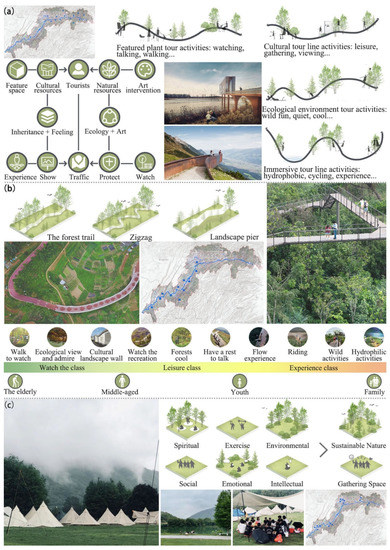 First, we suggest building landscape-viewing platforms to improve the accessibility of the natural landscape (Figure 5a). Comprehensively integrating the cultural heritage landscape genes of the TGRA into these viewing platforms could help to showcase the region in all aspects. Meanwhile, we suggest construction of a unique, digital cultural landscape website of the reservoir area to share these natural landscapes. The website could contribute to displaying photography works; therefore, these viewing platforms are vital photography spots to help tourists find the best viewing position of the reservoir scenery and attract more visitors to go there. Four routes were designed to connect these viewing platforms: (1) a cultural route that connects with cultural heritage and could provide the functions of relaxation, gathering, and appreciation; (2) an eco-environment route that links with mountain and water landscape and is characterized by wildness, quietness, and coolness; (3) a feature vegetation route characterized by appreciation, conversation, and walking; and (4) an immersion route that ties in with cycling and experiencing activities. This landscape-planning scheme increases the diversity of motivations for travel, thus increasing the number of tourism visits to the TGRA. In addition, the setting of viewing platforms enhances the sense of participation, interaction, and benign bonding with the TGRA, which makes visitors have a better tourism experience.