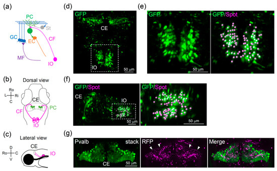 Cerebellar circuits in zebrafish: (a) Schematic diagram of the cerebellar circuits in zebrafish. (b,c) Schematic diagram of the olivocerebellar circuits: (b) Dorsal view and (c) lateral view. (d–f) Distribution of inferior olive neurons in Tg(hspGFFDMC28C;UAS:GFP) zebrafish at 7 days post-fertilization (dpf): (d,e) Dorsal view, with a high-magnification image shown in (e), where spots indicate the position of the soma of inferior olive neurons. (f) Dorsolateral view, with a high-magnification image of the inferior olive shown in the right panel. (g) Dorsal view of the cerebellum of Tg(hspGFFDMC28C;UAS:RFP) larva stained with Parvalbumin 7 (Pvalb) at 6 dpf (confocal z-stack images). Arrowheads indicate CFs. CE, cerebellum; CF, climbing fiber; EC, eurydendroid cell; GC, granule cell; IO, inferior olive; MF, mossy fiber; PC, Purkinje cell; St, stellate cell; Ro, rostral; C, cordal; L, left; Ri, right; D, dorsal; V, ventral.