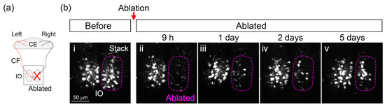 Changes in the inferior olive neurons after two-photon laser ablation: (a) Schematic diagram of the zebrafish inferior olive and cerebellum. CE: cerebellum, CF: climbing fiber, IO: inferior olive; (b) Dorsal view of the inferior olive (confocal z-stack images). The red dashed lines indicate the ablated region (the right hemisphere of the inferior olive). Before ablation: ⅰ, after ablation: ⅱ (9 h), iii (1 day), iv (2 days), and v (5 days).