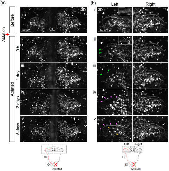 Because IO neurons project to the contralateral side of the cerebellum (Figure 4a) [38], we expected that the CFs in the left hemisphere would exhibit abnormalities. Confocal imaging of the olivocerebellar circuit showed that, approximately 9 h after the ablation, CFs in the left hemisphere were disrupted, and some of the axon bundles disappeared (5/6 fish, Figure 4aii,iii,bii,iii, green arrowheads). In addition, aggregation was observed in the cerebellum (Figure 4aii,bii, white arrowheads). This aggregation gradually disappeared over two days. Interestingly, two days after the ablation, a long bundle of axons appeared in the cerebellum (Figure 4biv,v, red arrowheads). These might be CFs that were recovered after the lesion. Furthermore, at four to five days after the ablation, we observed thin fibers that extended from the thick bundle of axons outward in various directions (Figure 4bv, yellow arrowhead). In the right hemisphere of the IO, however, such clear changes were not observed. These results suggest that although the CFs were severely damaged after the IO ablation, they could partially recover in less than a week.