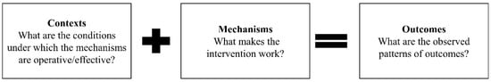 Realist evaluation examines the underlying mechanisms of an intervention (what makes the intervention work?), the contexts under which the mechanisms operate (what are the conditions under which the mechanisms are operative/effective?), and the patterns of outcomes produced (what are the observed patterns of outcomes?) in CMO configurations (Contexts + Mechanisms = Outcomes) [7,9]. Figure 1 depicts the relationship between contexts, mechanisms, and outcomes in a CMO configuration. To evaluate an intervention, realist evaluation involves an iterative cycle that has four steps of (1) developing initial MRTs (i.e., a descriptive format of CMO configurations), (2) planning and implementing the intervention, based on these initial MRTs and collecting empirical data relevant to the mechanisms, contexts, and outcomes of the initial MRTs, (3) analysing and synthesising empirical data based on observed outcomes to formulate empirical MRTs, and (4) testing (i.e., confirming, refuting, or modifying) initial MRTs against the empirical MRTs [8,14].