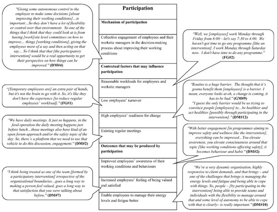 Outcome three: enable employees to manage their energy levels and fatigue better. District-level managers pointed out that participation by providing job autonomy to employees regarding task management, decision making on the job, and skills to be able to rotate or work across jobs, as needed, would enable them to manage their energy level and fatigue. They highlighted that fatigue was associated with the schedules of the employees, including the early hours of their shifts, working multiple jobs, and the pace of the workday; hence, allowing employees to schedule their tasks would enable them to match their tasks with their energy level, which would ultimately reduce their fatigue.