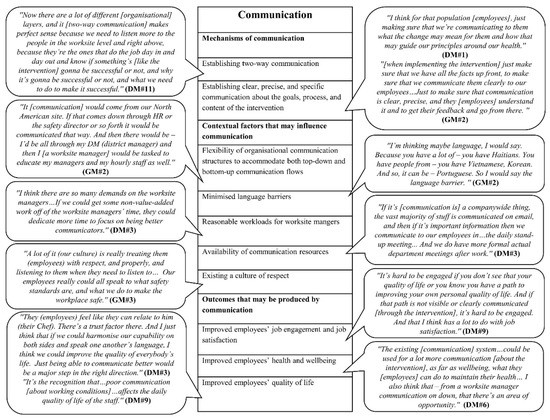 Regarding the initial MRT about communication, the literature provides the causal relationship between mechanisms and contexts as, to trigger communication, there should be flexibility of organisational communication structures to accommodate both top-down and bottom-up communication flows [40], minimised language barriers [11], reasonable workloads for worksite managers [41], availability of resources [37], and a culture of respect [42]. Regarding the causal relationship between mechanisms and outcomes, the literature illustrates that communication produced outcomes of improved employees’ job engagement and job satisfaction and improved employee health and wellbeing [42]. We do not have causal evidence between the mechanism of communication and the outcome of improved employee quality of life, as of yet.