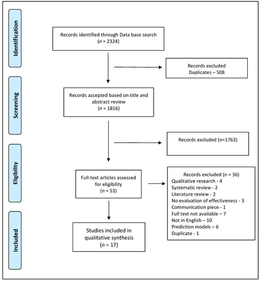 Initially, there were a total of 2324 articles from all the four databases—PubMed, EMBASE, Global Health and WHO regional indexes. After removing 508 duplicates, 1816 articles were considered for title and abstract review. After abstracts were read, 1763 articles that were irrelevant based on the inclusion and exclusion criteria were removed. From these, 53 articles were considered suitable for full-text review. Thirty-six articles were excluded for reasons such as qualitative studies (n = 4), reviews (n = 4), full text not available (n = 7), not in English (n = 10), no evaluation of effectiveness or prediction models (n = 9), and duplicate/communication (n = 2). The remaining 17 articles met the inclusion criteria. The PRISMA flowchart exhibiting the study selection process is presented in Figure 1.