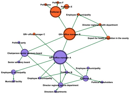 The actors who were assigned the highest centrality measures where the two politicians and the chairperson of the senior advisory board, who were considered as holding multiple contacts, especially to other politicians, diverse volunteer associations, administrational structures, and general practitioners (Figure 3).
