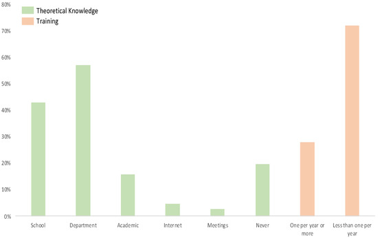 Among 107 responders, 61 (57%) reported no theoretical lessons during school (medical school, nursing school, driving school, or firefighter training programs), 61 (57%) reported that they were taught in their hospital or fire department, 17 (15.9%) had official training after school, five (4.7%) were trained during a conference, and 21 (19.6%) declared that they had never had any theoretical lessons on HAZMAT. Thirty-seven (34.6%) never had any training on a HAZMAT disaster, 38 (35.5%) had less than one per year, ten (9.4%) had one per year, and only 22 (20.6%) had more than one per year (Figure 1). Lastly, 33 (30.8%) declared that they did not know what type of personal protective equipment (PPE) was mandatory in the event of a HAZMAT disaster. Eleven respondents (14.9%) did not know where the PPE at their workplace was kept.