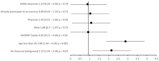 We found a significant impact on VAS stress (up to 25 points) in the case of the absence of theoretical background (risk ratio = 2.15, CI95% 1.05–3.28, p = 0.01), and an age of 35 years old or younger (RR 2.88, 95% CI 1.94–4.29, p < 0.001). However, there was no protective effect or risk factor associated with being a HAZMAT leader (RR = 0.92, 95% CI 0.21–4.03, p = 0.91); a physician (RR = 1.03, 95% CI 0.52–2.06, p = 0.93); male (RR = 1.08, 95% CI 0.7–1.67, p = 0.74); and, more interestingly, a physician working in the SAMU (RR = 1.23, 95% CI 0.45–1.73, p = 0.94) or in responders that already had training (RR = 0.89, 95% CI 0.45–1.75, p = 0.45) ( Figure 2).