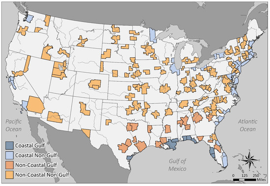 59]. Here, coastal MMSAs in general had higher proportions of non-whites, but Gulf coastal MMSAs were less diverse (higher proportions of whites) and more comparable to ethnic proportions of non-coastal areas. Based on race-health associations [