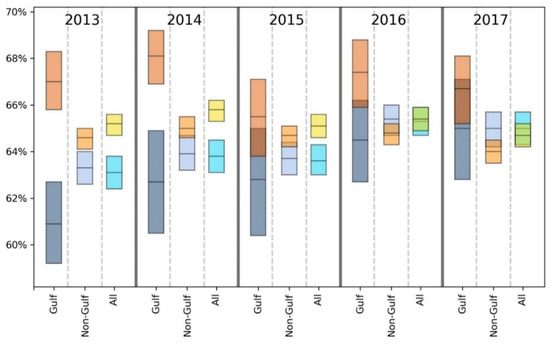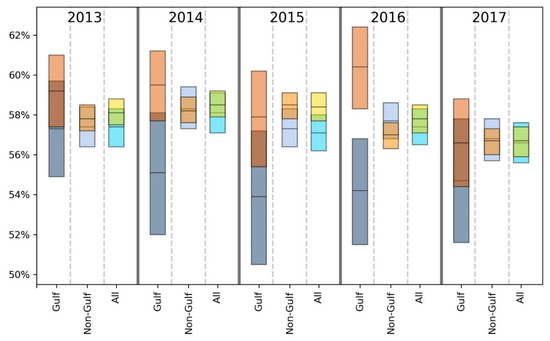 For MUHDs, the new analysis rendered the previously significant greater proportion of non-coastal respondents in the 0 days category NS for years 2013 and 2015, while the year 2017 resulted in a newly significant greater proportion of coastal residents in the 0 days category. While results from the initial coastal vs. non-coastal analysis yielded mixed results for MUHDs, statistically significant MUHD results of this assessment indicate only a comparatively positive health status associated with coastal MMSAs. With PMUHDs, this non-Gulf analysis resulted in newly significant relationships for the years 2013 and 2014, where higher proportions of non-coastal respondents were in the ≥14-day category. Again, all statistically significant differences in PMUHDs generated by this non-Gulf assessment indicate only a comparatively positive health status associated with coastal MMSAs. The cumulative means from this analysis for PUHDs, MUHDs, and PMUHDS all were significantly lower (better) for coastal than non-coastal, with PUHD newly significant in this non-Gulf assessment (
