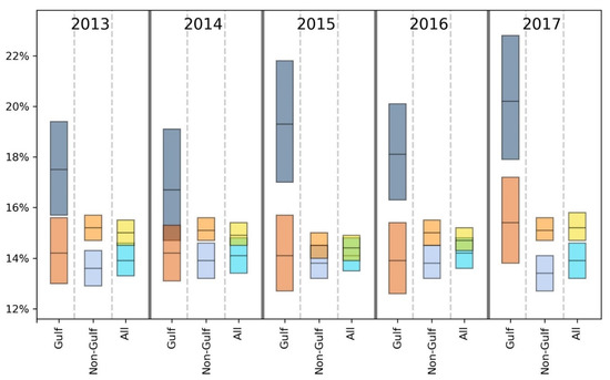 Figure 7). The coastal PUHDs showed a significantly lower proportion of responses in the 0-days category in 2 of 5 years (2013, 2014) and significantly higher responses in the ≥14 unhealthy days category in 4 of 5 years. The MUHD data showed a similar trend for Gulf coastal MMSAs, with significantly lower percentages in the 0-day category for 2 years (2013, 2015), and significantly higher in the ≥14-day category for those years as well as 2014. The PMUHD data revealed no significantly better results in the 0-day category for coastal in any year, with 2016 indicating significantly poorer health. Four of 5 years showed significantly higher (worse) responses in the ≥14-days category for the coastal respondents. Similarly, in comparing mean numbers of unhealthy days, the Gulf coastal MMSAs reported higher numbers of PUHDs in all years, MUHDs in 3 of 5 years (2013, 2014, 2015), and PMHUDs in all years. The overall mean numbers of unhealthy days were significantly higher for the coastal MMSAs in the PUHD, MUHD, and PMUHD categories, averaging 0.58–1.16 more unhealthy days for the Gulf coastal vs. Gulf non-coastal (