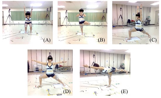 Five common standing yoga asanas were tested in this study: Chair (Sanskrit name: Utkatasana), Tree (Vrksasana), Warrior 1 (Virabhadrasana 1), Warrior 2 (Virabhadrasana 2), and Warrior 3 (Virabhadrasana 3). The five standing yoga poses are illustrated in Figure 1, and the instructions of five asanas were as follows. Chair pose (Utkatasana): Stand with your feet approximately hip-width apart. When practicing it, one has to make sure the knees are pointing straight ahead and to press the shoulders down and back and stare at a point in front of you for balance. Tree pose (Vrksasana): Bend the rising leg knee and shift all of the weight into the supporting leg. The supporting leg must remain steadily on the floor. Warrior 1 pose (Virabhadrasana I): With the front limb knee directly over the ankle, straighten the back limb by pressing the heel towards the floor. The arms are over the head in an H position with the palms facing each other. Warrior 2 pose (Virabhadrasana II): Keep the front limb toes to the right direction and your front heel aligned with your back foot arch. Bend the knee directly over the ankle. Sink the hips down towards the floor, and keep the head up to lengthen the spine. Warrior 3 pose (Virabhadrasana III): Shift all of the weight onto the supporting leg and keep it straight. Raise the back leg up and keep the hips, trunk, arms, and head in one straight line for the final position.