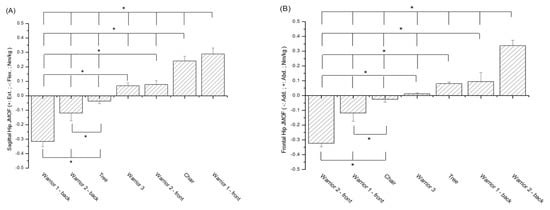 In the sagittal plane (Figure 2A), significant differences were found in the hip flexor/extensor JMOFs of the seven limbs in post hoc tests, except for between the front limb for Warrior 2 and Warrior 3. In the frontal plane (Figure 2B), the post hoc results showed significant differences in the hip adductor/abductor JMOFs of the seven limbs, except for between the back limb for Warrior 1 and Tree.