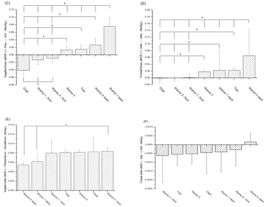 (A) Comparison of the hip JMOFs of the seven limbs in the sagittal plane. * denotes a significant difference in Bonferroni post hoc tests; (B) comparison of the hip JMOFs of the seven limbs in the frontal plane. * denotes a significant difference in Bonferroni post hoc tests; (C) comparison of the knee JMOFs of the seven limbs in the sagittal plane. * denotes a significant difference in Bonferroni post hoc tests; (D) comparison of the knee JMOFs of the seven limbs in the frontal plane. * denotes a significant difference in Bonferroni post hoc tests; (E) comparison of the ankle JMOFs of the seven limbs in the sagittal plane. * denotes a significant difference in Bonferroni post hoc tests; (F) comparison of the ankle JMOFs of the seven limbs in the frontal plane. * denotes a significant difference in Bonferroni post hoc tests.