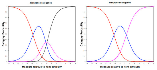 Response category curves for the original response category approach (left) and the modified approach with categories 3 and 4 collapsed to form a 3-point scale (right). As a partial-credit model was used due to the varying response categories between items, this figure used item 12 as an example.