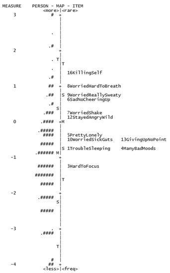 Person-item map of Distress subscale. Each ‘#’ represents 2 participants; each ‘.’ represents 1 participant. M = mean, S = 1 standard deviation (SD), T = 2 SDs.
