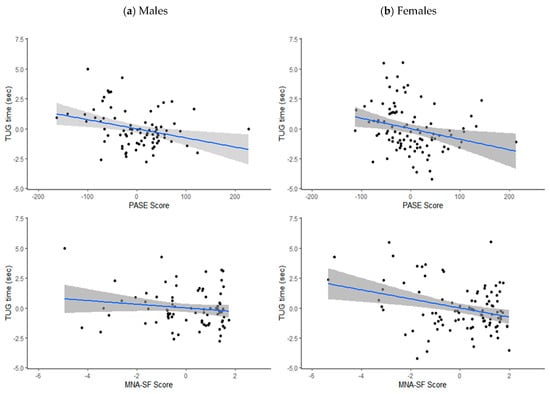 Partial correlation plots (adjusted for age, area of residence and body mass index) with standard error for PASE score and MNA-SF score with TUG time (s) in (a) males and (b) females.