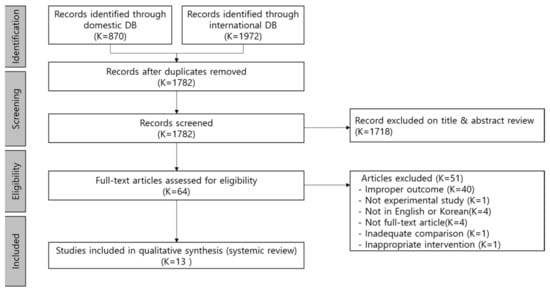 We retrieved 870 articles from domestic databases and 1972 articles from international databases for our analysis. Once duplicate articles were removed, 1782 articles remained. The titles and abstracts of each of these articles were reviewed, and 1718 articles did not comply with the inclusion and exclusion criteria. Finally, 64 articles remained after the screening process. The full text of each of these articles was reviewed, and the following 50 articles were excluded in total: 40 articles that contained no report on immunological outcomes, one article with non-experimental study, four articles that were not published in English or Korean, four articles whose original version could not be retrieved, one article with inadequate comparison, and one article on indirect forest therapy (aromatherapy). Thus, only 13 peer-reviewed articles were selected for further analysis (Figure 1).