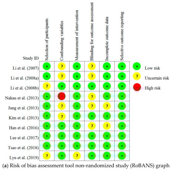 The RoBANS is composed of the following six items: selection of participants, confounding variables, measurement of intervention (exposure), blinding for outcome assessment, incomplete outcome data, and selective outcome reporting. The risk was assessed using “low risk”, “high risk”, and “uncertain risk” categories. “uncertain risk” means that the study is judged to raise some concerns in at least one domain, but not to be at high risk of bias for any domain. In this study, two researchers independently performed a quality evaluation. When there was a disagreement between the two researchers, included a third-party researcher in their discussion to help bring them to an agreeable conclusion.
