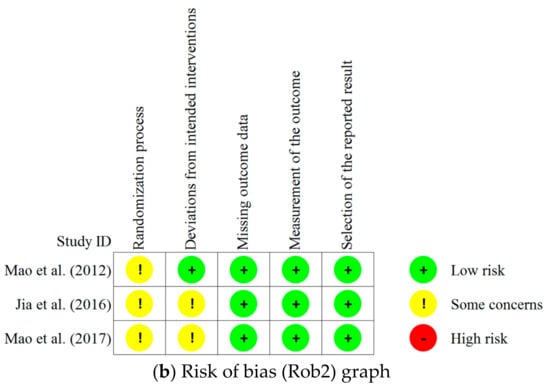 The risk-of-bias assessment tool for RCTs is composed of the following five domains: randomization process, deviations from intended interventions, missing outcome data, measurement of the outcome, and selection of the reported result. The risk of bias assessment for these domains was performed using three categories: “low risk”, “some concerns”, and “high risk”.